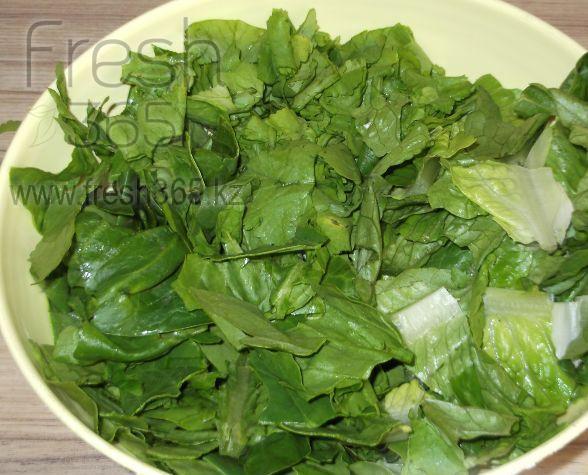 Салат ромэн представляет из себя кочан вытянутой формы. Листья хрустящие и очень сочные, хотя и довольно волокнистые. Кстати, как и белокочанная капуста, салат ромэн снаружи зеленый, а внутри становится беловато-зеленым.
